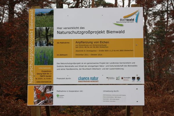 Umwandlung von naturfernen Nadelholzbeständen in naturnahe, eichenreiche Mischwälder. Damit soll die Eiche als bedeutende Baumart und hinsichtlich ihrer Bedeutung für die Biodiversität und tragenden Funktion für die Eichen-Lebensraumtypen im Bienwald gefördert bzw. unterstützt werden.
