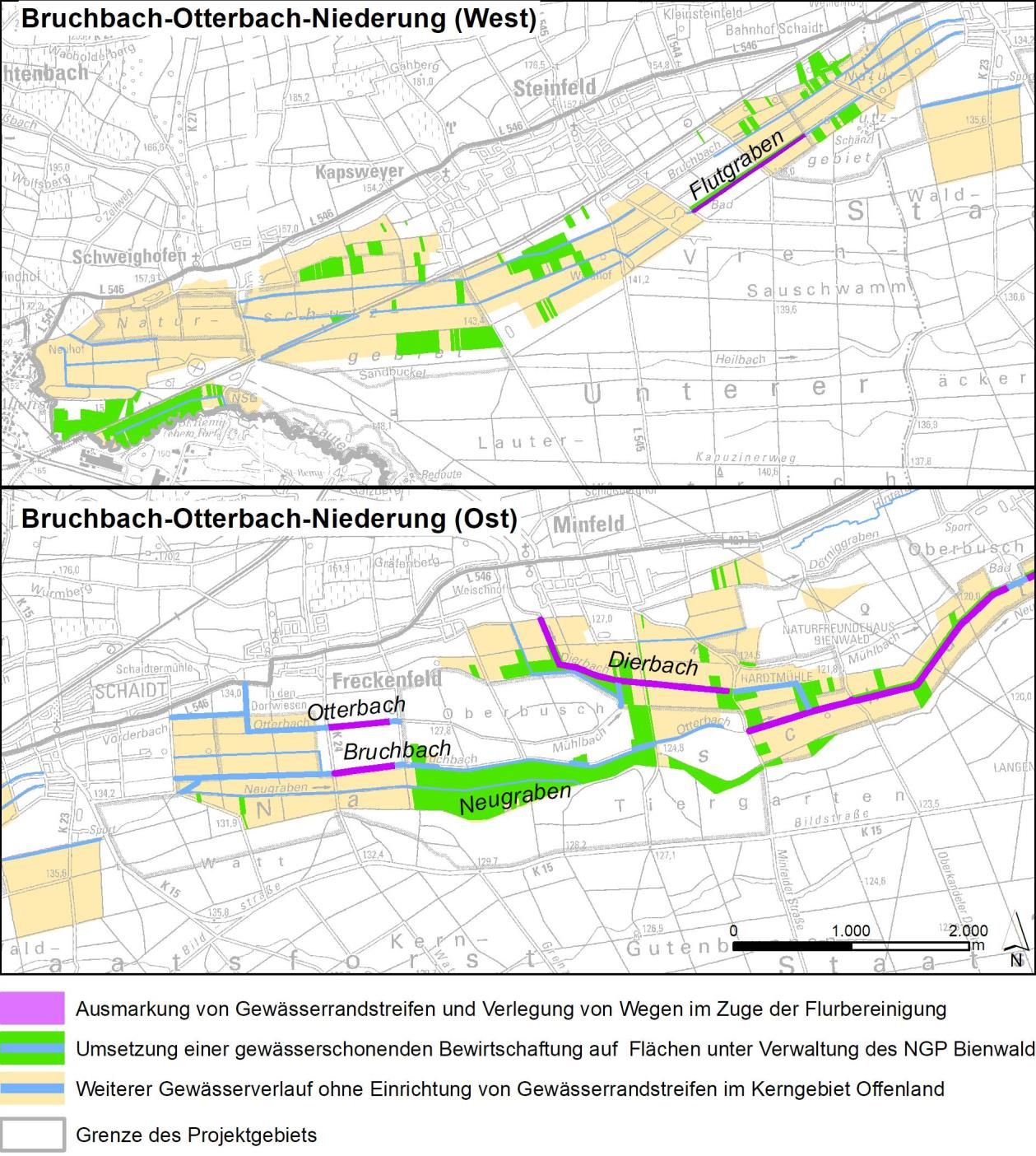 Die Anlage von Gewässerrandstreifen erfolgte im Zuge der Flurbereinigungsverfahren bzw. der Grünlandextensivierung in der Bruchbach-Otterbach-Niederung. Insgesamt wurden vier Gewässerrandstreifen angelegt: Der Gewässerrandsteifen am Dierbach (nördlicher Teil) ist beidseitig 20 Meter breit und verläuft zur Abgrenzung des Nutzungsmosaiks von dort bis zu K16 einseitig. Der einseitig neu angelegte Gewässerrandstreifen südlich von Freckenfeld entlang des Bruchbachs zwischen Sportplatzweg und Oberbusch wurde nur auf der Nordseite des Bruchbachs und westlich des Oberbuschs realisiert, da sich auf der Südseite Grünlandflächen unmittelbar anschließen. Der Gewässerrandstreifen am Otterbach westlich des Oberbuschs wurde auf beiden Seiten des Gewässers aufgrund der mangelnden Flächenverfügbarkeit mit einer reduzierten Breite von 10 Metern angelegt. Außerdem ist durch den Wegebau eine weitere Pufferfläche vorhanden. Der Gewässerrandstreifen am Flutgraben südöstlich von Steinfeld wird über Pachtverträge mit den Bewirtschaftern der Flächen im Besitz des NGP Bienwald umgesetzt.